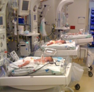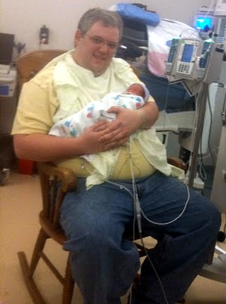 ![]() Momma lost quite a bit of blood, and that scared Daddy. He was in shock most of the day. There was a team of people for each of us in the operating room. We were wisked off to a staging area for assesment. We were all put on oxygen. Our APGAR scores would good eights and nines. Everyone had ten fingers and toes. Daddy made sure to ask about that. After about fifteen minutes we were on our way to NICU II upstairs on the forth floor. We stopped in the hallway to say hi to Nana, Gumpy, Aunt Charity, Madison, and Nana D. Here is a picture of us lined up in the NICU II nursery: |